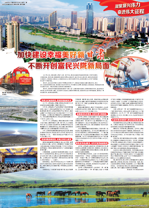 2017年以来,甘肃省深入贯彻“三新一高”导向,紧扣加快建设幸福美好新甘肃、不断开创富民兴陇新局面,负重自强、顽强拼搏,推动各项事业全面进步,综合实力迈上新台阶,脱贫攻坚战取得全面胜利,全面建成小康社会,全面建设社会主义现代化顺利开局,在甘肃发展史上书写了崭新篇章、留下了厚重印迹。