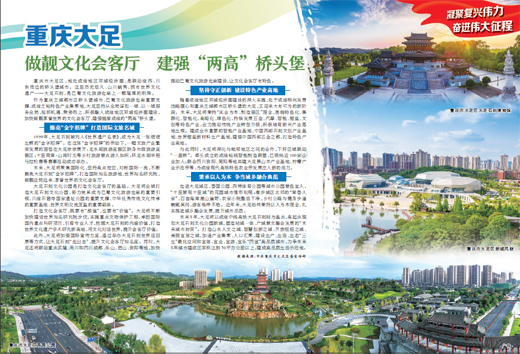 作为重庆主城都市区桥头堡城市、巴蜀文化旅游走廊重要支撑、成渝主轴特色产业集聚地,大足坚持从全局谋划一域、以一域服务全局,抢抓机遇、乘势而上,积极融入成渝地区双城经济圈建设,加快做靓享誉世界的文化会客厅、建强链接成渝的“两高”桥头堡。