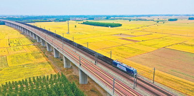 图为武陟县黄绿相间的麦田与飞驰而过的列车构成一幅美丽画卷。