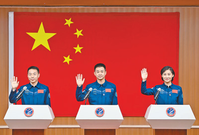 6月4日,执行神舟十四号载人飞行任务的3名航天员陈冬(中)、刘洋(右)、蔡旭哲在酒泉卫星发射中心与媒体记者集体见面。 |