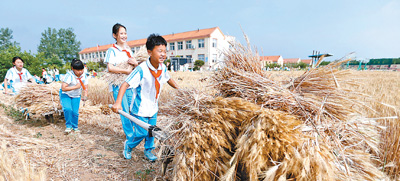 图为学生在麦田里运送收获的小麦。