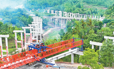 重庆市酉(阳)彭(水)高速公路铜西互通段建设工程稳步推进。酉彭高速建成后,从酉阳到重庆主城的时间预计将缩短至3小时以内。图为6月12日,互通段项目的桥墩上在架设预制桥梁。