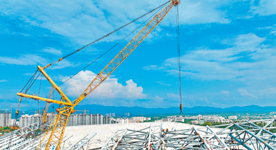 6月10日,江西省赣州市全民健身中心项目建设工地,施工方正在高空架设主场馆外围和顶棚钢架。