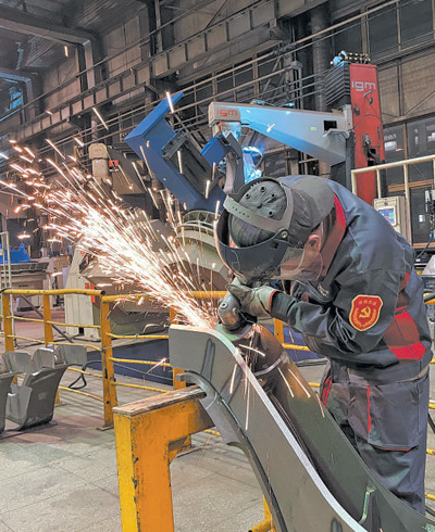 中车长春轨道客车股份有限公司转向架焊接产线组加班生产,对工件进行精心打磨。 杨 康摄