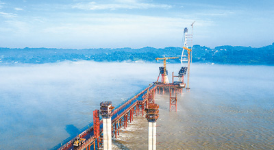 6月14日,四川省泸州市合江县的榕山长江大桥项目建设现场,大桥2号主墩及承台正在施工。榕山长江大桥南岸连接榕山临港工业园区,北岸将与宜泸渝高速公路互通立交连接。