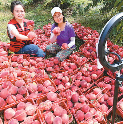 图为当地群众在果园直播销售水蜜桃。