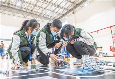 近日,贵州省毕节市2022年青少年机器人竞赛开幕。活动设置无人机挑战赛、无人驾驶技能竞赛、超轨普及赛、机器人投篮对抗赛等6个项目,来自全市45支代表队、200名选手参与角逐。图为参赛选手在进行赛前调试。