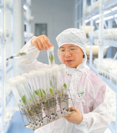 海南天然橡胶新型种植材料创新基地,科研人员在观察橡胶树组培苗生长情况。 |