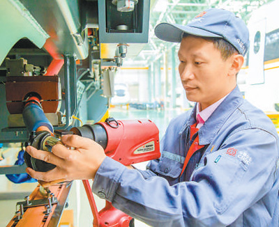 上身探入高铁车底,电线、端口密布,右手举焊枪,左手拇指食指捏电线、中指推送焊锡丝,抬头眯眼……走进中车长春轨道客车股份有限公司装配产线组,铁路车辆电工、高级技师胡俊祥(见图,邵越摄)正在焊接连接器。