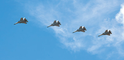 搏击海天,克敌制胜。飞行教官介绍,持续开展高强度飞行训练,有助于提升飞行人才队伍培养质效。图为战机空中编队飞行。