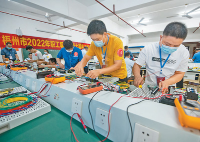 7月3日,广西壮族自治区梧州市总工会组织开展劳动技能竞赛活动,激发职工的工作热情,培育更高水平技能人才。图为职工参加电工技能竞赛。