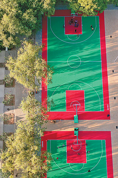 近年来,甘肃省张掖市甘州区为满足群众多层次、多样化的健身需求,因地制宜,合理规划,健全完善体育设施场所,打造公园、广场等休闲健身区。图为7月6日,在甘州区润泉湖公园,市民在篮球场上锻炼。