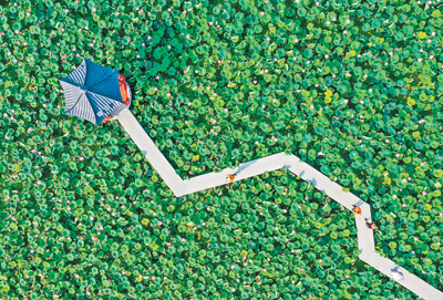 炎炎夏日,游客们在景色如画的湖北省应城市四里棚街道孙熊村万亩荷花塘游玩观光。