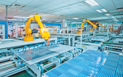 七月十八日,在浙江省湖州市一家科技公司,工人和机器人在自动化生产车间作业,赶制发往欧洲的产品订单。