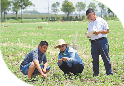 徐淙祥(右一)和儿子徐健(左一)、孙子徐旭东查看作物生长情况。 |