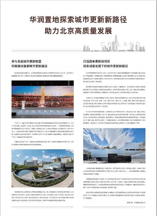 定位为领先的城市投资运营发展商,华润置地以片区统筹理念推动北京城市改变和发展,为加强首都“四个中心”功能建设、转变城市建设方式、推动城市高质量发展、构筑新时代首都人民美好生活图景,写下重要篇章。