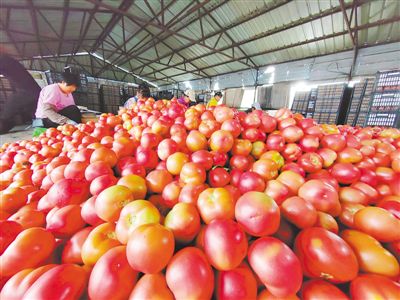 在头茬西红柿大棚里,粉红的西红柿正被装筐送往收货点,分等、装箱,然后运往各地。