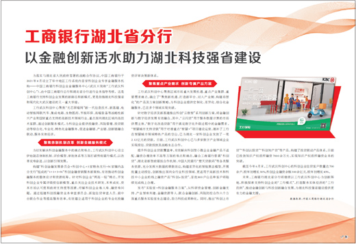 为落实与湖北省人民政府签署的战略合作协议,中国工商银行于2021年4月设立了华中地区工行系统内首家科创企业专享金融服务机构——中国工商银行科创企业金融服务中心(武汉)(简称“工行武汉科创中心”),由中国工商银行总行和湖北省分行进行业务指导考核。这是工商银行支持科创企业发展的新路径和新模式,更是助推湖北科技强省和现代化大武汉建设的又一重大举措。