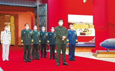 下午4时30分许,习近平来到中国人民革命军事博物馆,步入展厅参观展览。展览聚焦以习近平同志为核心的党中央领导国防和军队建设的伟大实践,安排8个单元展区,设置“党在新时代的强军目标”、“重整行装再出发”、“砺剑铸盾 奔向一流”、“大好河山 寸土不让”、“爱我人民爱我军”、“深情励三军 奋进新征程”等重点展项,通过1400余件文物实物、630余张照片、近百套武器装备模型以及大量图表、视频、艺术作品、互动项目等,生动展示了新时代国防和军队建设的壮阔历程和伟大成就,充分展现了人民军队忠诚维护核心、矢志奋斗强军的昂扬风貌。习近平不时驻足观看,认真听取讲解,询问有关情况。