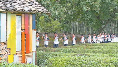 像这样的作品,在史子园还有很多。从形式到内容,都能看出艺术家的巧思和对乡土的感知。以制茶的茶碾为灵感制作的镜面装置“小碾深瓯”;从村民家里搜集来的腌菜缸、粮斗等组成“记忆的容器”;竹林茶园间,长出一个空中“鸟巢”,一座“天梯”,一盏“大地之灯”……村庄给予艺术家们丰富的灵感,艺术也增添了村庄的活力。