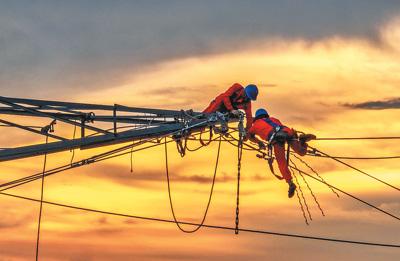 8月2日,广东省广州市从化区,电力工人迎着晚霞在空中作业。