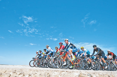 8月3日,第二十一届环湖赛第八赛段格尔木绕圈赛进行,参赛选手在察尔汗盐湖边骑行。 |