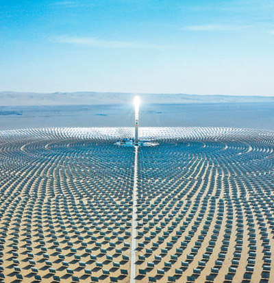 走进场区,宛若置身科幻世界:以这座260米高的吸热塔为圆心,1.2万块定日镜逐层散开,像向日葵上按层排列的一粒粒种子,其中最远的一层距离塔心1.5公里。