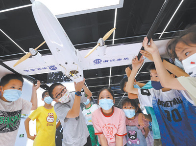 暑假期间,浙江省湖州市德清县三桥小学学生在德清地理信息科技馆了解无人机知识。