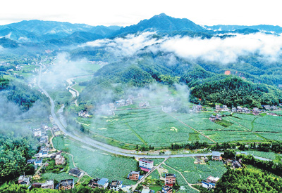 青山环绕的湖南省桂东县水湾村是乡村旅游示范村,目前已建成农家乐30余家,今年连片种植荷花600余亩,并配套建设了步道、休闲亭等服务设施。图为8月6日拍摄的水湾村,流云之下,连绵青山、山脚民居与穿村而过的河流等构成一幅现代农村的秀美画卷。