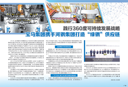 宝马集团大中华区总裁兼首席执行官高乐表示,与钢铁行业联动减碳,是宝马集团2021年发起“产业链绿色转型倡议”后的一个重要进展,更是两个行业在绿色转型上的一次突破性合作。遵循“家在中国”承诺,宝马希望与中国本土伙伴一起以创新技术推进绿色低碳发展、为“双碳”目标作出贡献。