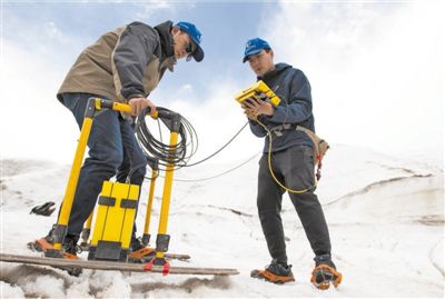 图为近日在格拉丹东雪山,科考队员董士琦(右)和范越使用地质雷达探测冰川。