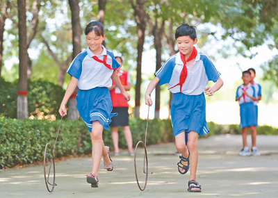 8月14日,山东省滕州市大坞镇,孩子们通过滚铁环感受传统游戏乐趣。