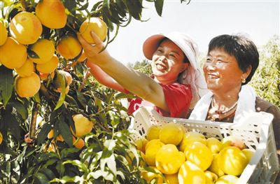 河南省尉氏县因地制宜,大力发展特色种植,果蔬产业成为当地农民增收致富的主导产业。图为门楼任乡赵存村村民在采收锦绣黄桃。