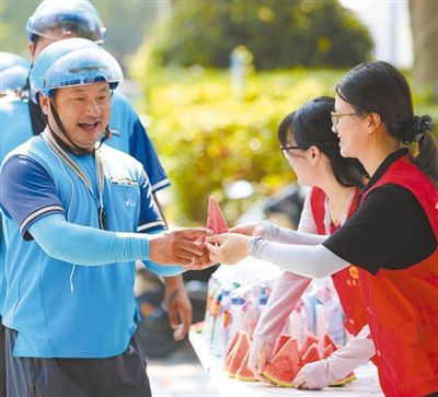 在浙江省湖州市德清县武康街道余英溪公园,工会志愿者将西瓜送到外卖员手中。 王 正摄(影像中国)
