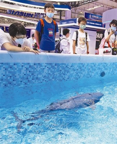 在水中游动的水下智能仿生机器鱼吸引不少参观者驻足。 |
