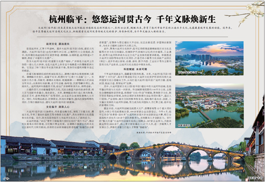 大运河(临平段)历来是京杭大运河航运功能较发达的河段之一,长约40公里,蜿蜒而来,孕育了杭州市临平区的江南水乡文化,也蕴藏着城市发展的动能。近年来,临平区厚植大运河沿线文化沃土,积极探索大运河优秀传统文化的保护、传承和利用,为千年文脉注入新的活力。