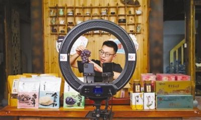 返乡创业青年陈上友在直播间向粉丝介绍当地的农产品。