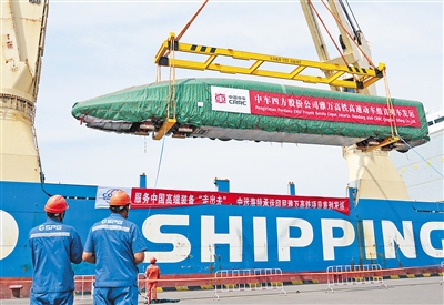 8月21日,我国出口印尼用于雅万高铁的1组高速动车组和1组综合检测列车从山东港口青岛港正式发运。图为日前,高速动车组正在青岛港装船。