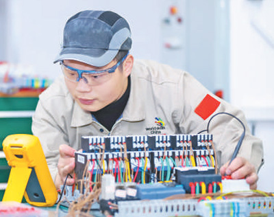 一身工服,再配以防护眼镜,江西省电子信息技师学院高级技师、第四十五届世界技能大赛电气装置项目冠军肖星星(见图,本报记者王丹摄)俯身于操作面板前:只见自动剥线钳上下翻飞,螺丝刀旋转固定,一根根线缆依序排列整齐;接通电路,装置顺畅运转……