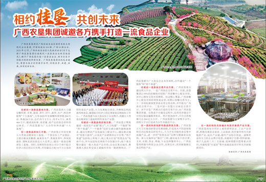 在一流食品深加工方面。广西农垦正布局发展五大类食品精深加工基地、一个食品加工产业园区。主要在粮油及糖酒、畜禽及水产、果蔬及茶叶、休闲及速食、调味及添加食品五大品类上,建设一批食品精深加工基地。同时,发挥明阳农场公司位于南宁临空经济示范区的区位优势,布局建设占地14平方公里的明阳食品产业园,大力发展航空食品、冷鲜制品和民族风味食品,建成临空经济示范区重要食品物流加工中心。广西农垦愿与各大食品加工企业携手,共建五大类食品精深加工基地和明阳食品产业园。