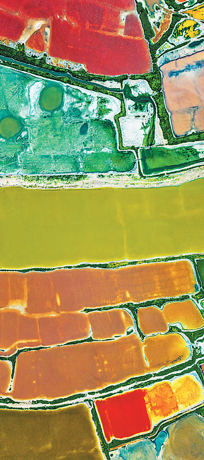 随着气温变化和空气质量提高,山西省运城市盐湖景区呈现色彩斑斓的美景,空中俯瞰,宛如巨型调色板,美不胜收。图为8月30日的盐湖美景。