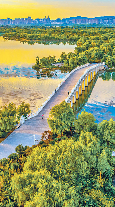 连日来,安徽省淮北市秋高气爽、天气晴好。图为9月4日拍摄的淮北市南湖国家城市湿地公园,满湖秋意美如画。