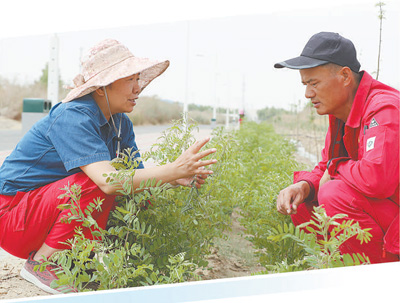 景观树下,他们又种了马兰、河西菊、狗牙根、甘草和苜蓿等草本植物。咸水灌溉、立体种植的塔中绿化,实现了沙地种树,绿树成林,林下有草,草中有花,林草并茂。