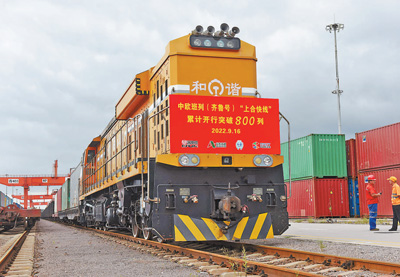 图为9月16日,一列载有100个标准箱货物的中欧班列(齐鲁号)“上合快线”,准备从位于青岛胶州市的上合示范区多式联运中心出发。