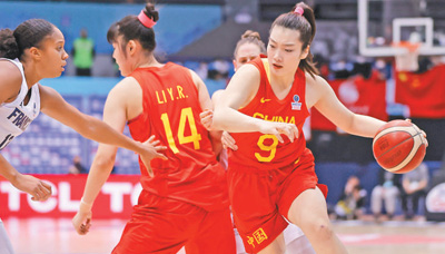 中国队在女篮世界杯预选赛比赛中三战全胜。图为中国队球员李梦(右)在战胜法国队的世预赛比赛中。 |