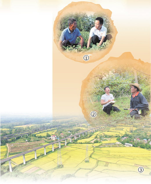 图①:安徽省阜阳市颍上县洪单村,选调生李勇(右)向村民了解红薯长势。 |