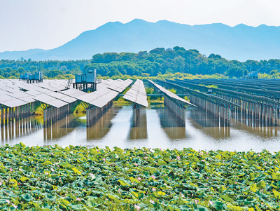 9月19日,江西省新余市分宜县,大型渔光互补光伏电站与湖、河、山川相映衬,蔚为壮观,构成绿色新能源生态景观。