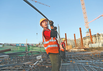 目前,北京海淀区西北旺镇大悦城项目正在建设中。该项目建成后将成为海淀北部区域配套最齐全、体量最大的商业综合体之一。图为工人们在建设施工。