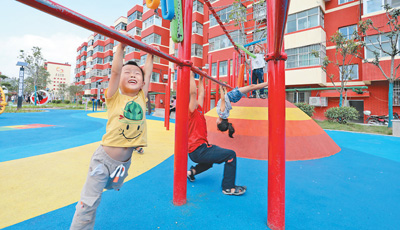 近日,山城区新改建的启善园内,孩子们在儿童游乐设施区玩耍。