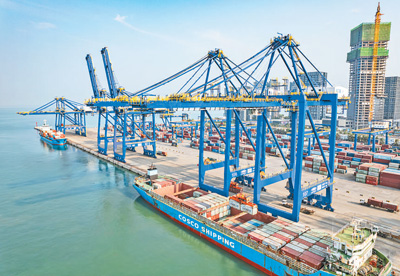 9月16日,海南海口港集装箱码头正在装卸集装箱,现场一派繁忙景象。今年前8个月,海南货物贸易进出口总值1257.5亿元,同比增长45%。